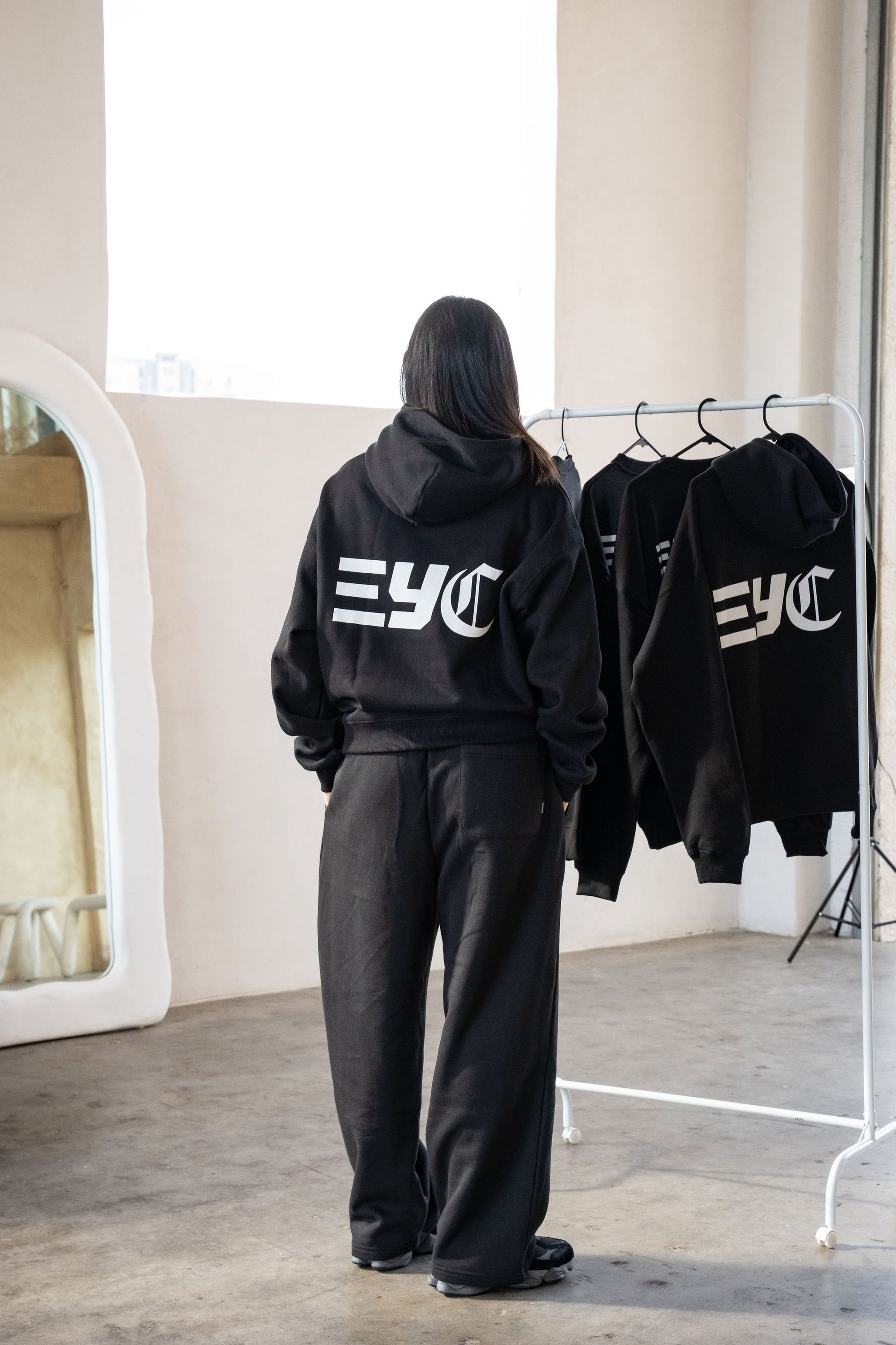 The EYC Core Hoodie features a relaxed, boxy fit crafted from heavyweight fabric for durability and comfort. Its exterior is made from 100% siro spun combed cotton, while the interior combines 80% cotton with 20% polyester in a brushed yarn blend, offering softness and warmth.